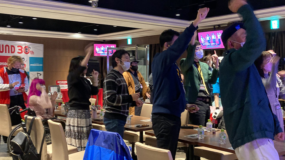 イベントの始めは、JOYSOUND30周年記念ソング「JOYSOUNDレッツゴー!」をアンバサダーメンバー全員で歌って声出しを行いました。