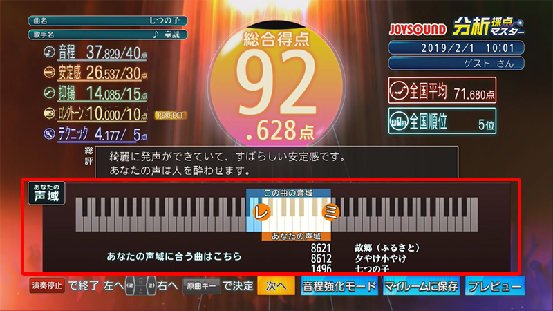 「次へ」ボタンを押すと、歌唱した楽曲の音域とあなたの声域が表示されます。また、あなたのキーに合った楽曲がおすすめされます。