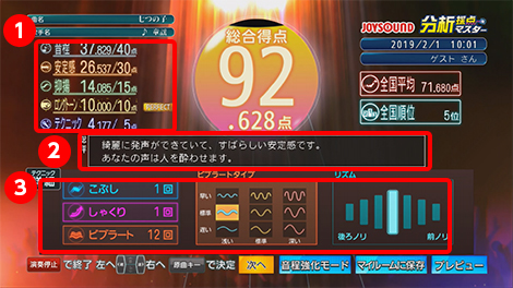 - こぶし、しゃくり、ビブラートの3つをテクニックとして採点しています。