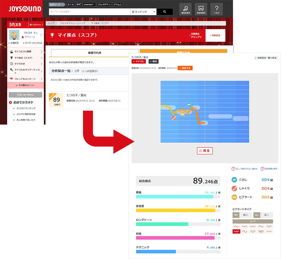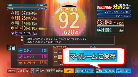 「マイルームに保存」を押し、うたスキWEBサイトにアップロードすると、お店で歌った歌声や採点結果がマイルームに保存され、パソコンやスマートフォンでいつでも復習することができます。