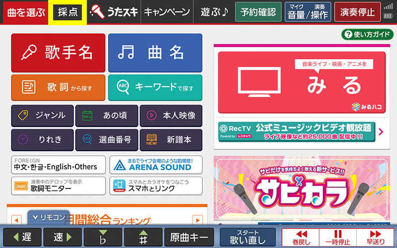 対応機種が設置されているお店のキョクナビ(リモコン)から「採点」ボタンを押します。