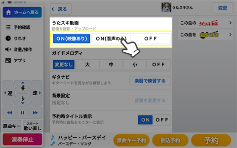 予約画面でうたスキ動画撮影「ON」を選択し、「予約」ボタンを押して撮影開始!