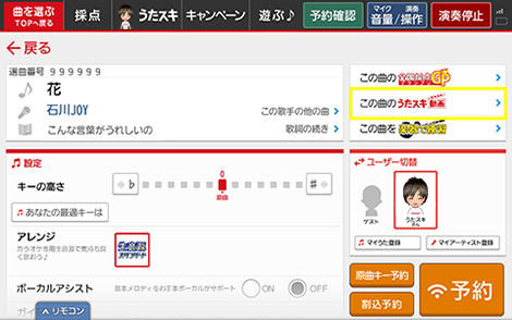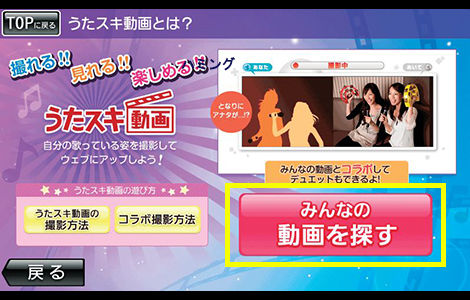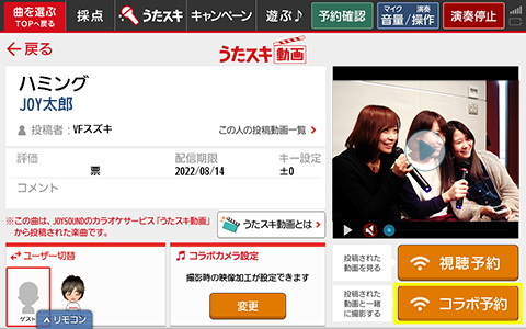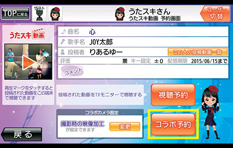 予約画面で「この曲のうたスキ動画」ボタンを押し、コラボしたい動画を選ぼう。