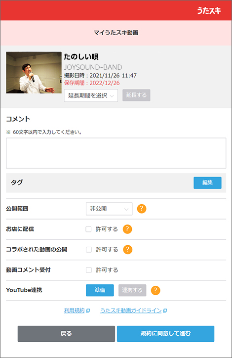うたスキWEBサイトのマイルームから「マイうたスキ動画」にアクセスし、コラボして欲しい動画の設定画面から「お店に配信する」に設定しよう。