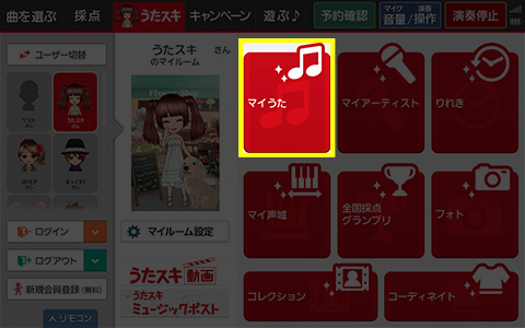 お店でキョクナビにログインしたら、マイルームからマイうたを呼び出そう。