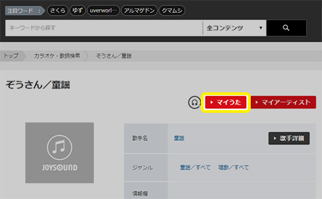 歌いたい曲を見つけたら、[▶マイうた]ボタンを押してマイうたに登録!
