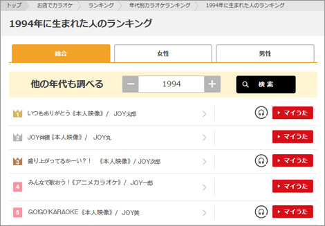調べたい年を入力し「検索」を押すと、その年に生まれた人が歌っている曲のカラオケランキングがわかります♪一緒に行く人達の年代で、よく歌われている曲を事前にチェックしてカラオケに行こう!盛り上がる事間違いなし♪