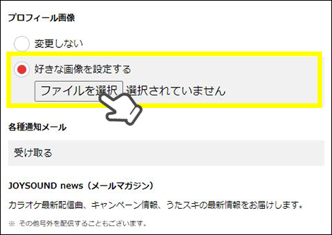ページ中程にある「プロフィール画像」の設定項目から「好きな画像を設定する」を選択し、「ファイルを選択」ボタンをタップして、プロフィール画像を設定しよう。