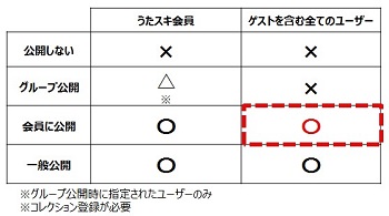 設定を行うことにより他のユーザーが閲覧できる範囲を制限することができます。それぞれの公開範囲は下記の通りです。 また、あわせて「お店に配信する」と設定すると、お店での視聴やコラボ動画の撮影が行えます。 ※CROSSOで視聴やコラボ動画の撮影を行う場合は事前にコレクション登録が必要です。 ・一般公開 【WEB】 うたスキへの登録やログイン状態に関わらず、どなたでも視聴することができます。 一般公開されている動画は「一般公開」マークが表示されます。 【お店】 本設定と「お店に配信する」設定を行うと、ゲストを含む全ての方がお店で視聴・コラボ撮影をすることができます。 ※一部のカラオケ機種のみ対応。 ※「一般公開」の設定だけを行っても、お店で視聴・コラボ撮影をすることはできません。 ・会員に公開 【WEB】 うたスキ会員全てのユーザーが動画の視聴をすることができます(うたスキWEBサイトへのログインが必要です)。 【お店】 本設定と「お店に配信する」設定を行うと、ゲストを含む全ての方がお店で視聴・コラボ撮影をすることができます。 ※一部のカラオケ機種のみ対応。 ※「会員に公開」の設定だけを行っても、お店で視聴・コラボ撮影をすることはできません。 ・公開しない 【WEB】 他のユーザーは動画の視聴をすることができません。 【お店】 お店に配信し、コレクション登録をすることによってご本人のみお店での視聴・コラボ撮影が可能です。