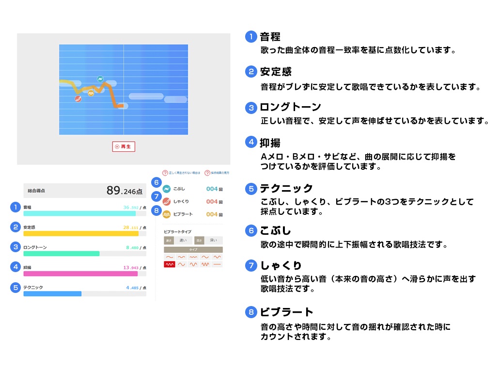 「分析採点AI+」「スマホで分析採点AI+」「分析採点AI」「スマホで分析採点AI」「分析採点マスター」 「スマホで分析採点」 「分析採点Ⅲ」で歌唱した楽曲の採点結果・音程グラフ・歌唱音声を確認することができます。 ※「結果りれき」に自動保存された結果には、音程グラフ・歌唱音声は含まれません。 ※分析採点Ⅲは、音声りれきのみ対応しています。 ※権利上の都合等により、一部結果を保存できない楽曲があります。