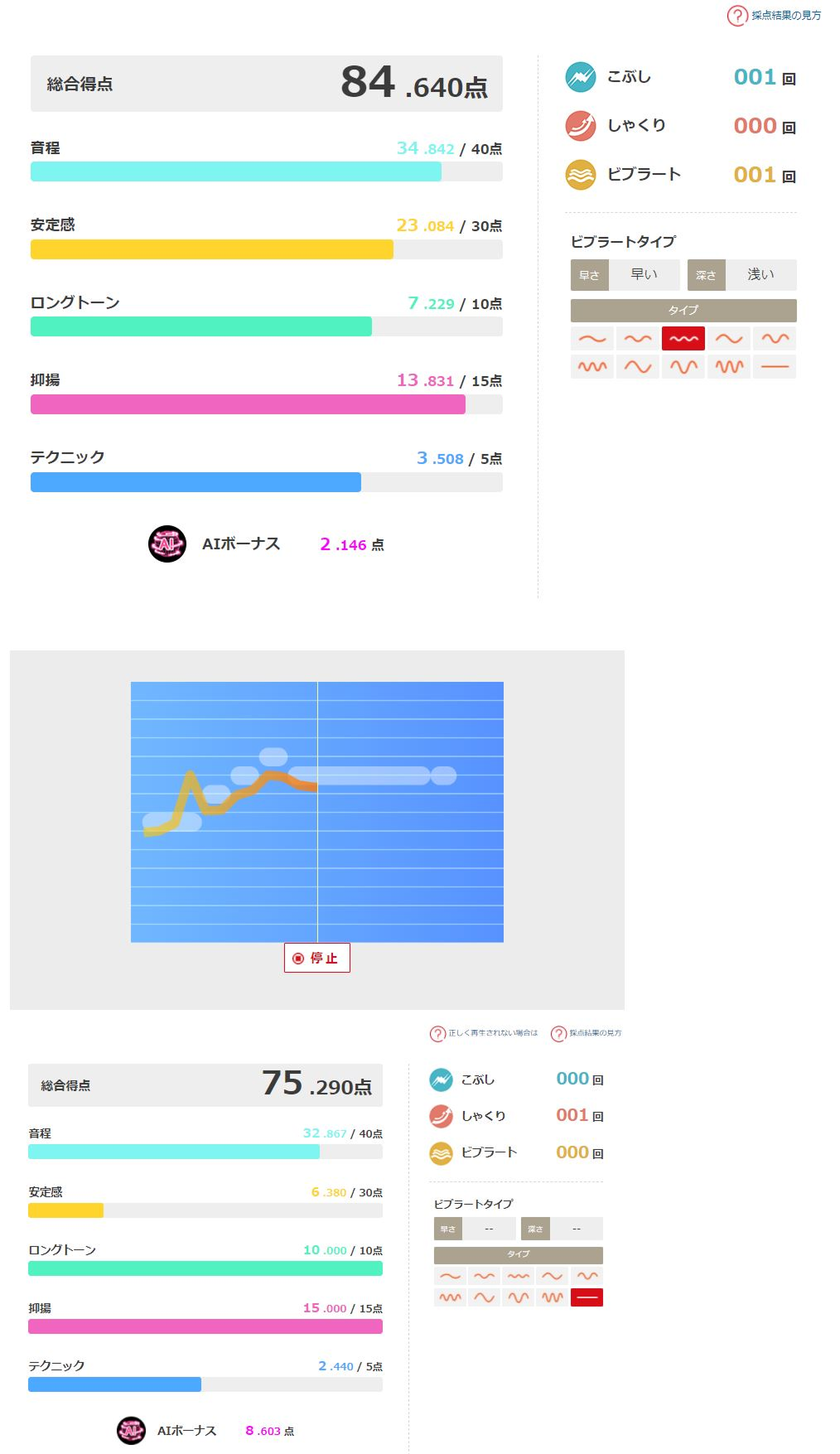 結果りれきと音声りれきで曲数が異なります。 【結果りれき】 保存できる曲数は最新の200件です。上限を超えた場合は古い結果から削除されます。 【音声りれき】 保存できる曲数は最新の1件のみです。 【自己ベスト】 保存できる曲数は最新の200件です。上限を超えた場合は古い結果から削除されます。