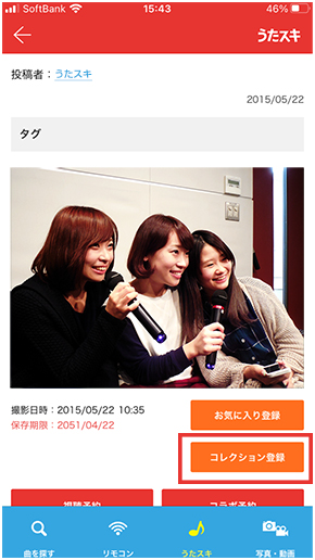 コレクション(コラボしたい)ボタンは、自分がコラボしたいと思った動画を登録する時に押すんだ!登録した動画は「マイうたスキ動画>コレクション(コラボしたい)」でいつでも確認できるよ。