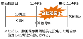保存期間は、通常は1ヵ月だよ!ただし、1ヵ月間で10再生以上だった動画は保存期間がもう1ヵ月増えるんだ。つまり、最大2か月保存が可能だよ。その他にも、直接課金で期間を設定して延長も可能だよ!その場合は、10再生の自動延長は無効になって設定した期間が優先されるから間違えないでね。