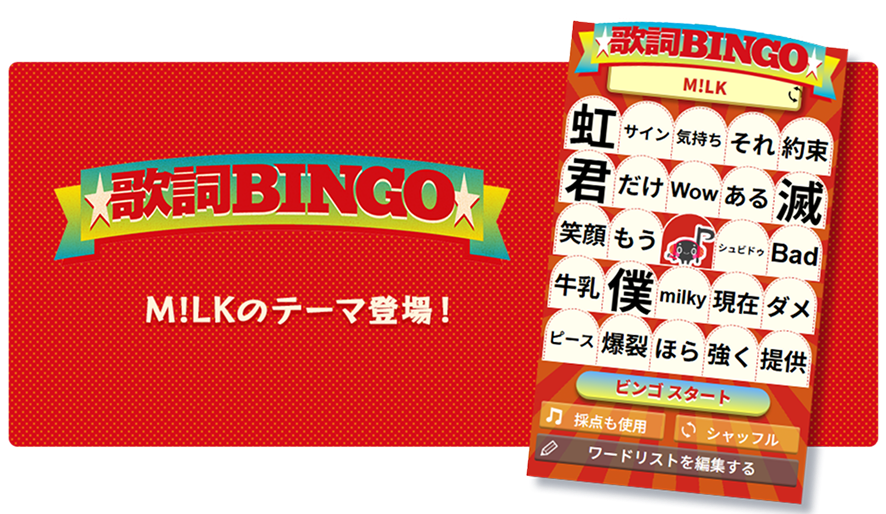楽曲の「歌詞」でビンゴを目指す、新感覚のビンゴゲーム!M!LKの歌詞をピックアップしたテーマが新登場!仲間とM!LK縛りカラオケでビンゴを目指して遊んでみよう♪