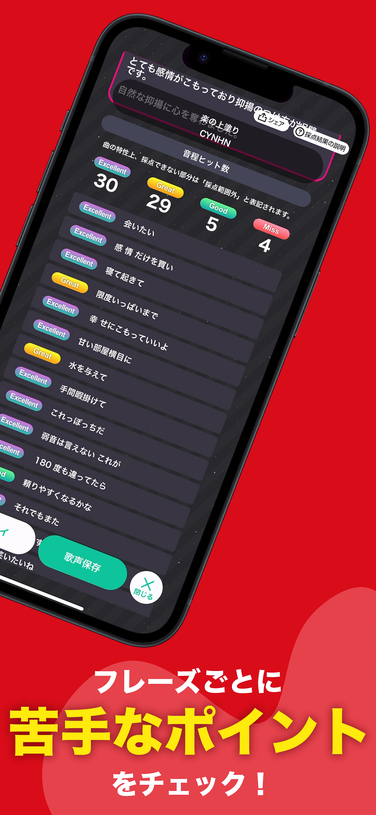 歌唱中と採点結果に音程ヒット数を表示!苦手なフレーズをチェックできる!