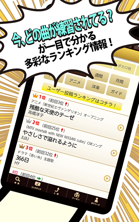 今まさに皆が歌っている曲が分かるリアルタイムランキングから、アニメやドラマなどジャンル別の豊富なランキングをご用意。