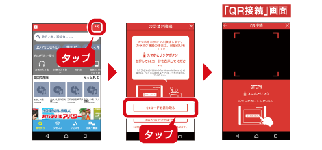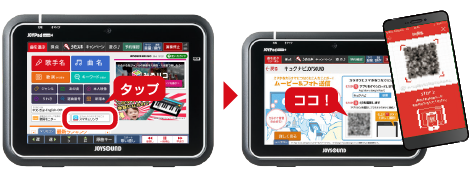 JOYPadキョクナビTOP画面の「スマホとリンク」をタップし、スマホでJOYPadキョクナビに表示されたQRコードを読み込み、スマホとカラオケをつなげます。
