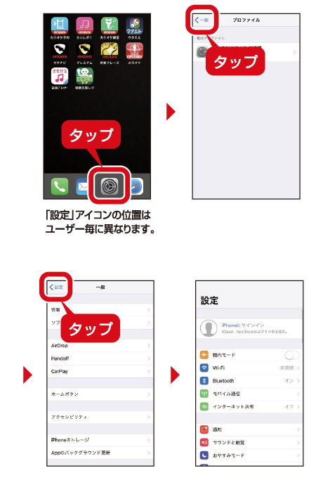 iPhoneのホーム画面から右記下記の手順で「設定」を開きます。