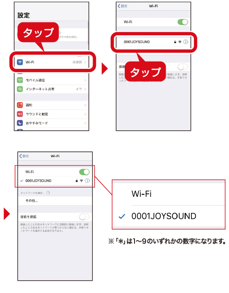 「Wi-Fi」をタップし「000* JOYSOUND」(※)を選択します。