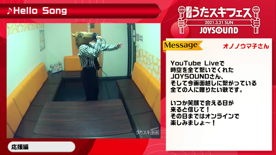 Live配信の前半は「うたスキフェスについてのトーク」と「過去2回のうたスキフェスステージ映像」、後半は「事前応募いただいたうたスキ動画のご紹介」の2部構成で行いました。当日の様子をダイジェスト映像にまとめましたので、是非合わせてチェックしてください♪